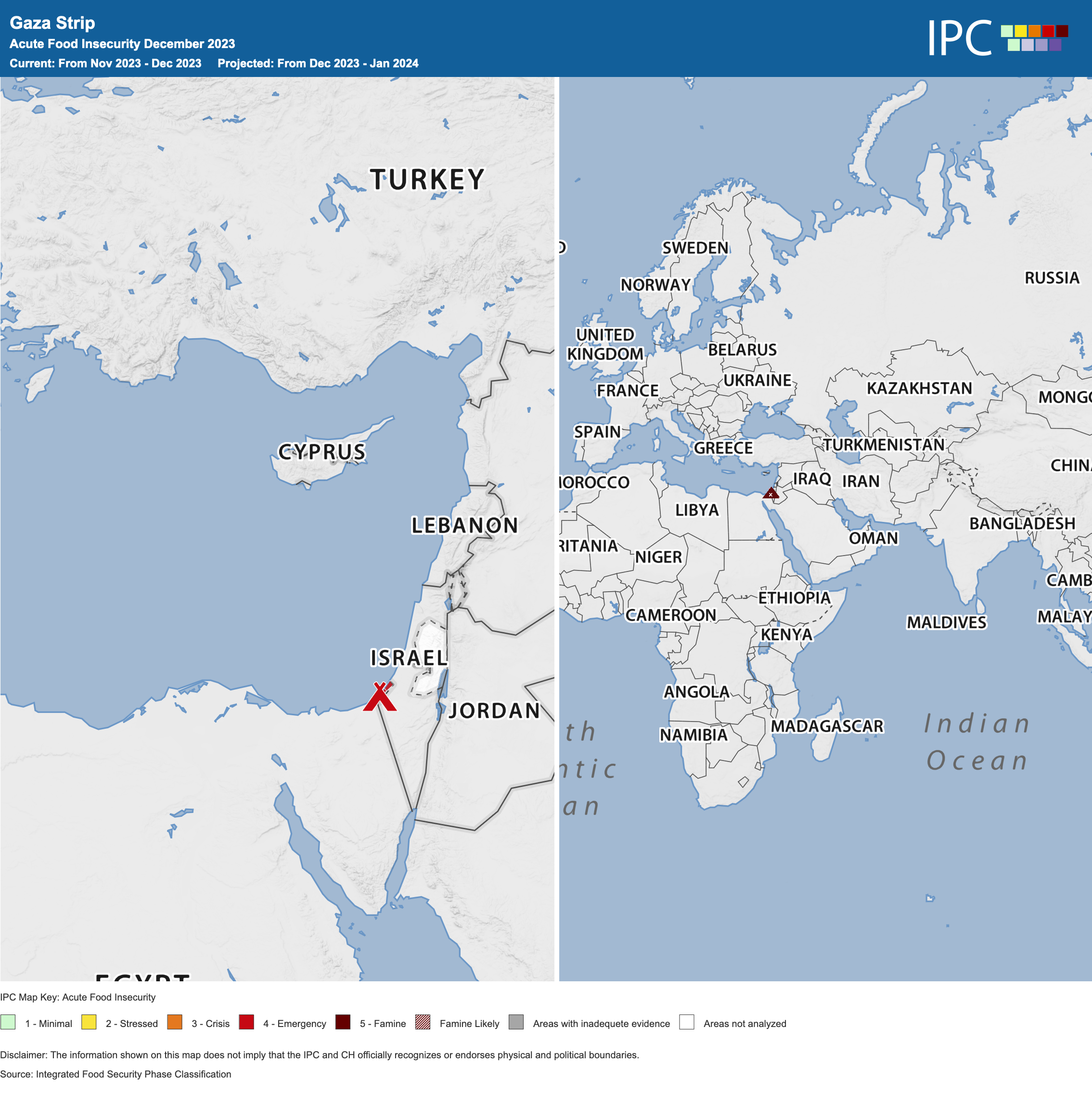 “The entire population in the Gaza Strip (about 2.2 million people) is classified in IPC Phase 3 or above (Crisis or worse). This is the highest share of people facing high levels of acute food insecurity that the IPC initiative has ever classified for any given area or country…. at least one in four households (more than half a million people) is facing catastrophic conditions – IPC Phase 5 (Catastrophe). These are characterized by households experiencing an extreme lack of food, starvation and exhaustion of coping capacities.” – Integrated Food Security Phase Classification (IPC) global partnership 21 December report